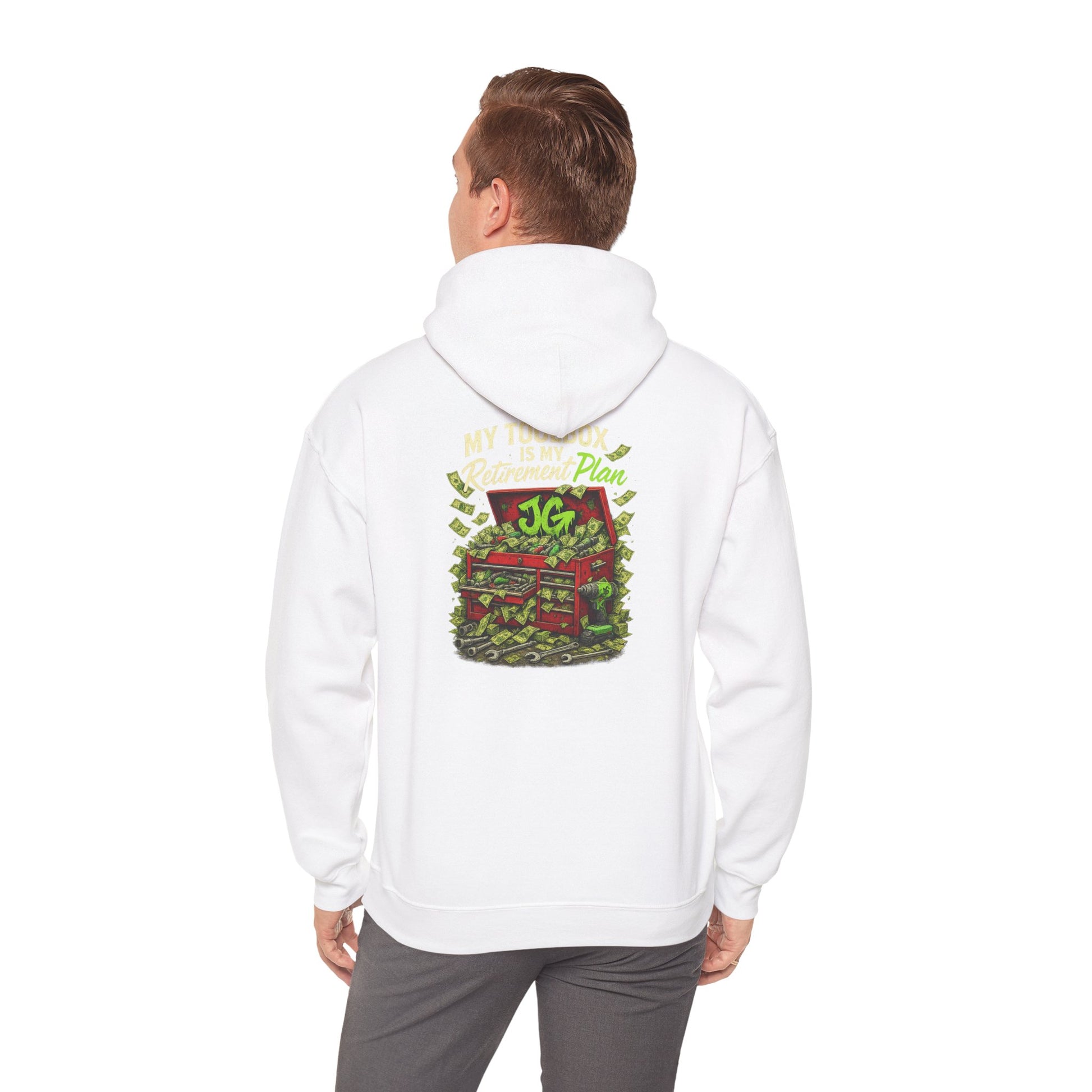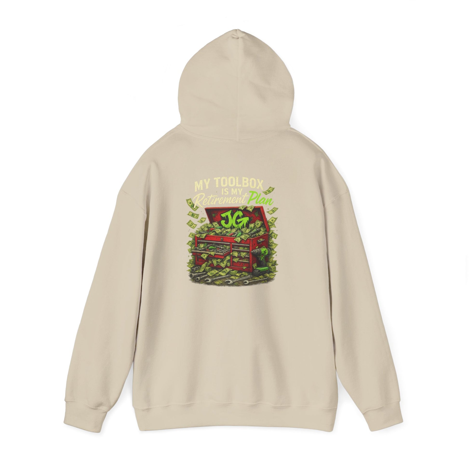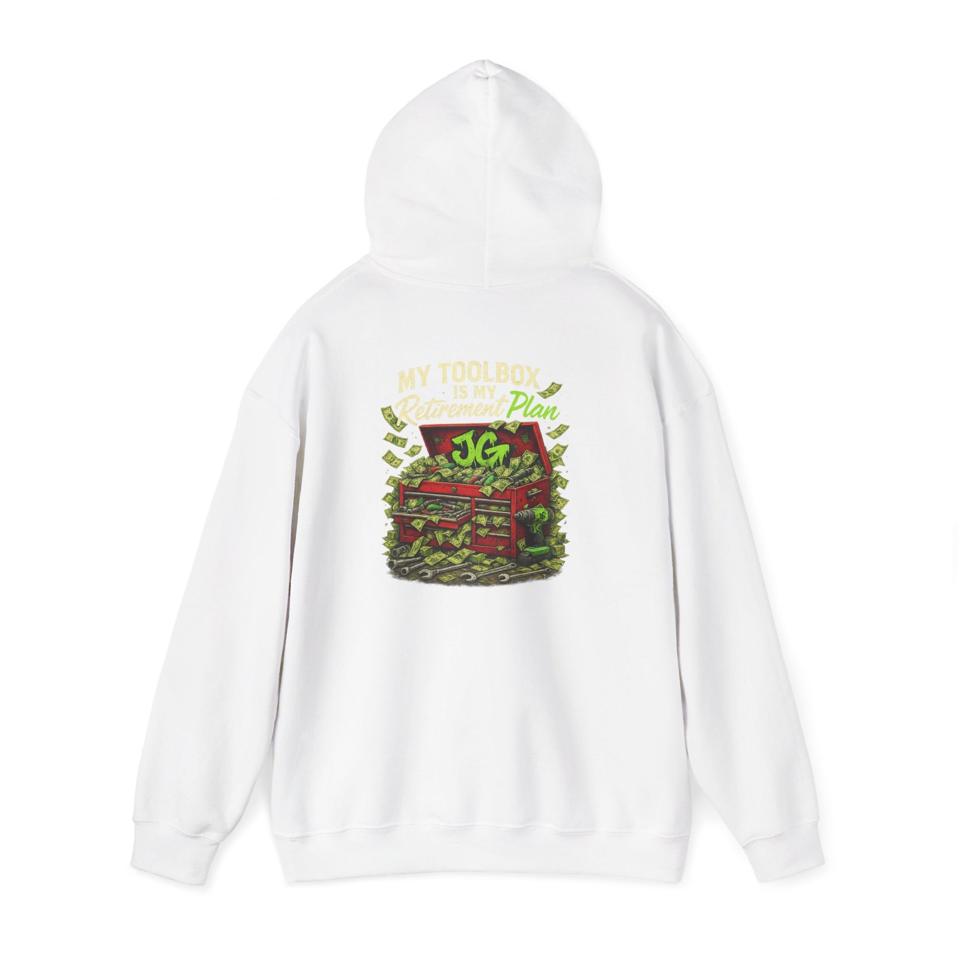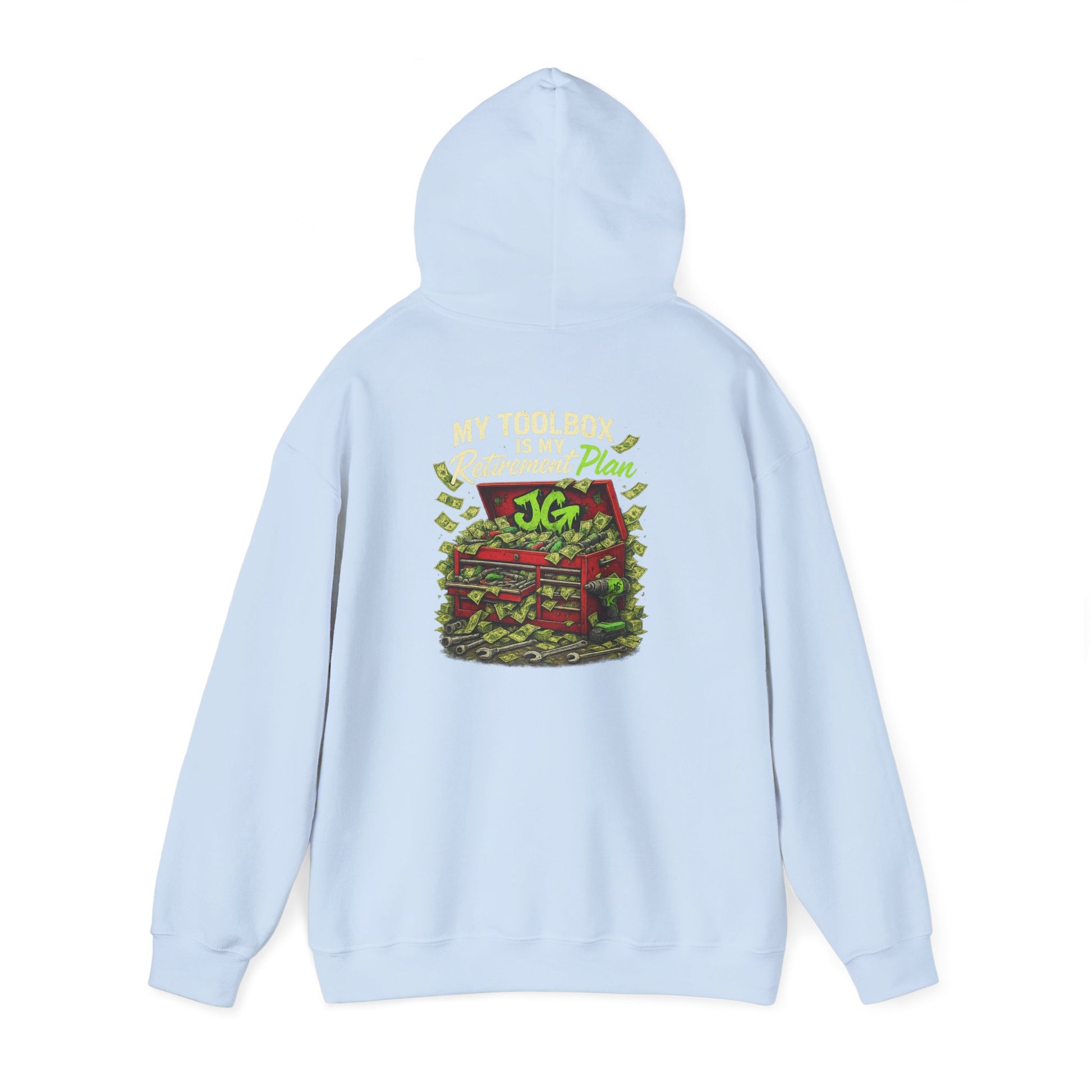 Forget Wall Street—this hoodie is for the real investors: sockets, wrenches, and busted knuckles. Featuring the bold “My Toolbox Is My Retirement Plan” graphic with a toolbox overflowing with greasy dollar bills and tools, this heavy blend hoodie is built for shop nights, cold garages, and weekend cruises.